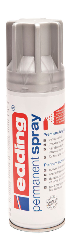 EDDING® Acryllack Spray Permanent deckt sofort, intensives und gleichmässiges Farbergebnis, geringer Sprühnebel, trocknet extrem schnell, staubtrocken nach ca. 1 – 3 Min., grifffest nach 10 Min., durchgetrocknet nach ca. 30 Min., hält dauerhaft im Innen- und Aussenbereich, kratz-, stoss- und schlagfest, lichtecht, vergilbungsfrei, geeignet für fast alle Oberflächen, austauschbarer Sprühkopf, 100% frei von gesundheitsschädlichen Schwermetallen. Dose zu 200 ml. Nachhaltigkeit eco:plus: recyclingfähig. seidenmatt silber