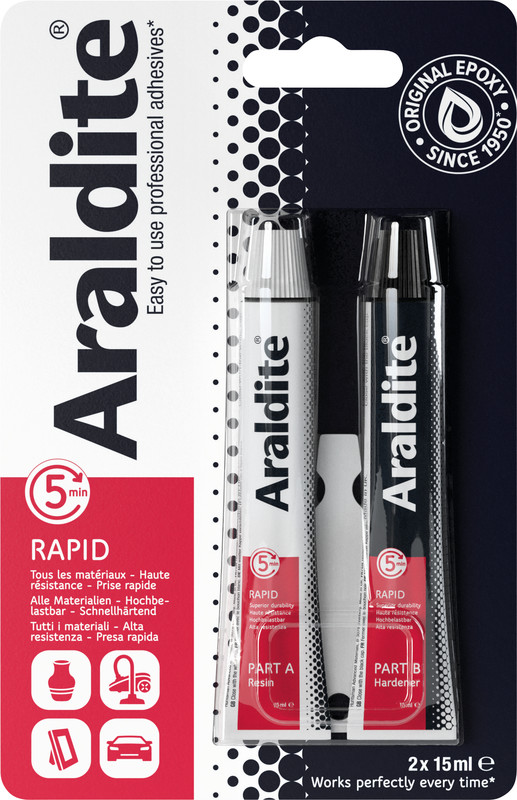 ARALDITE® Zweikomponenten-Klebstoff Rapid hochbelastbar, schnellhärtend, klebt Metall, Holz, Porzellan, Glas, Beton, Leder und verschiedene Kunststoffe (ausser PP, PE, Teflon®), wasserfest, temperaturbeständig von -30 bis +65°C, schleif- und überstreichbar, lösungsmittelfrei, 5 Min. Verarbeitungszeit, 1 Std. Fixierungszeit, definitiver Halt nach 3 Std. 2 x 15 ml Tuben