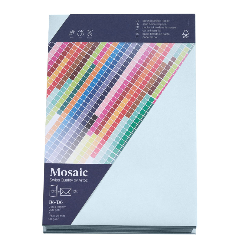 Erlebe die künstlerische Vielfalt des Mosaic Papiers von Artoz und lass deine Projekte in einem faszinierenden Mustermeer erstrahlen. Mit seiner großen Farb- und Formatauswahl ist es ideal für den Druck, perfekt zum Stanzen und Stempeln sowie für Origami und andere Falztechniken – für unendliche Gestaltungsmöglichkeiten und beeindruckende Kreationen. – Karton 200g/m² – Format: B6, Karte hochdoppelt, mit Falzrille – 240 × 169mm – Papier 90g/m² – Format: B6, Umschlag, ungefüttert – Spitzenklappe gummiert – 178 × 125mm – Set mit je 10 Stück im Cellophan Beutel – FSC®- Zertifiziert