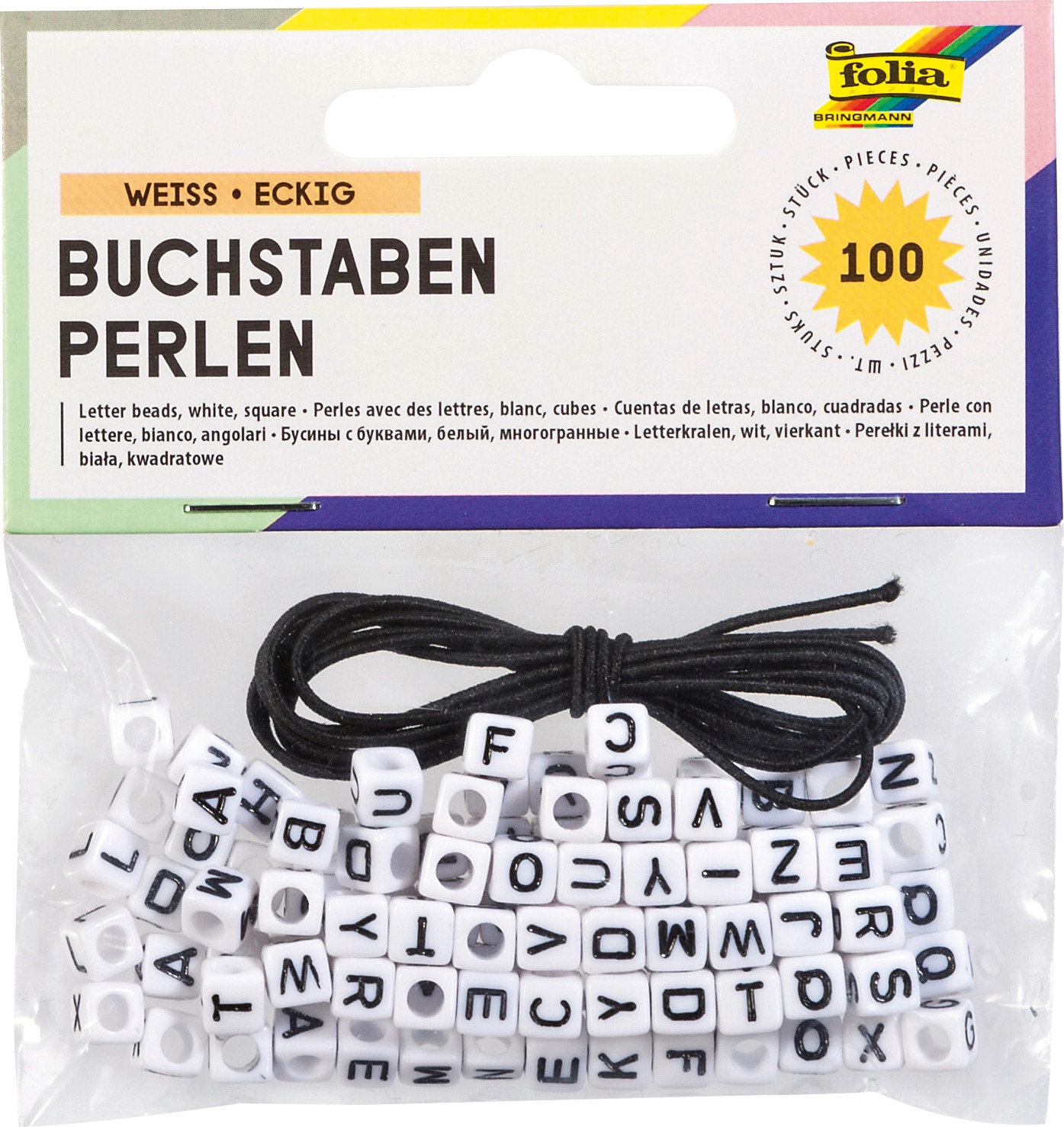 FOLIA® Buchstaben Perlen aus Kunststoff, eckig. Masse: B 6 x H 6 x T 6 mm. Beutel zu 100 Perlen und 1 m Gummiband. weiss