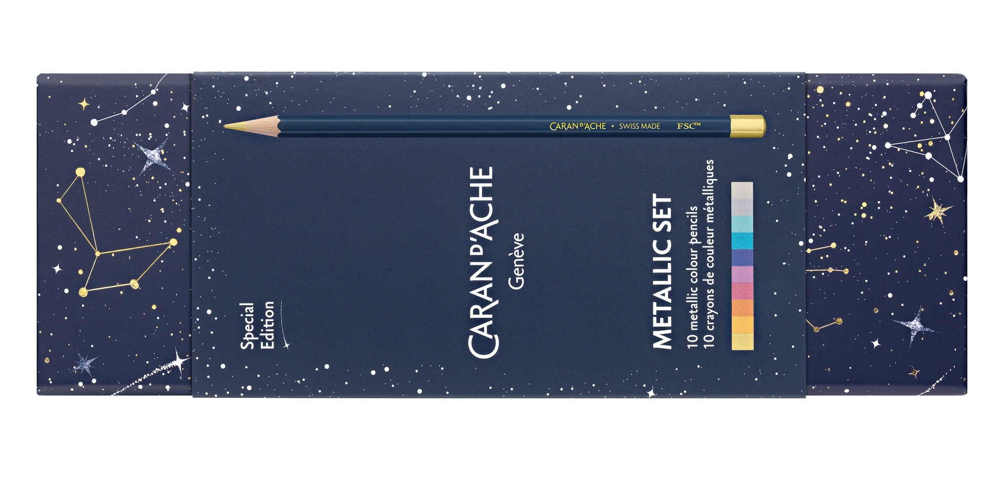 kantig, mit weicher Mine Ø 3 mm, 10 Metallic-Farben, im Kartonetui. Masse Verpackung: B 182 x H 24 x T 65 mm. Gewicht Verpackung: 90 g.