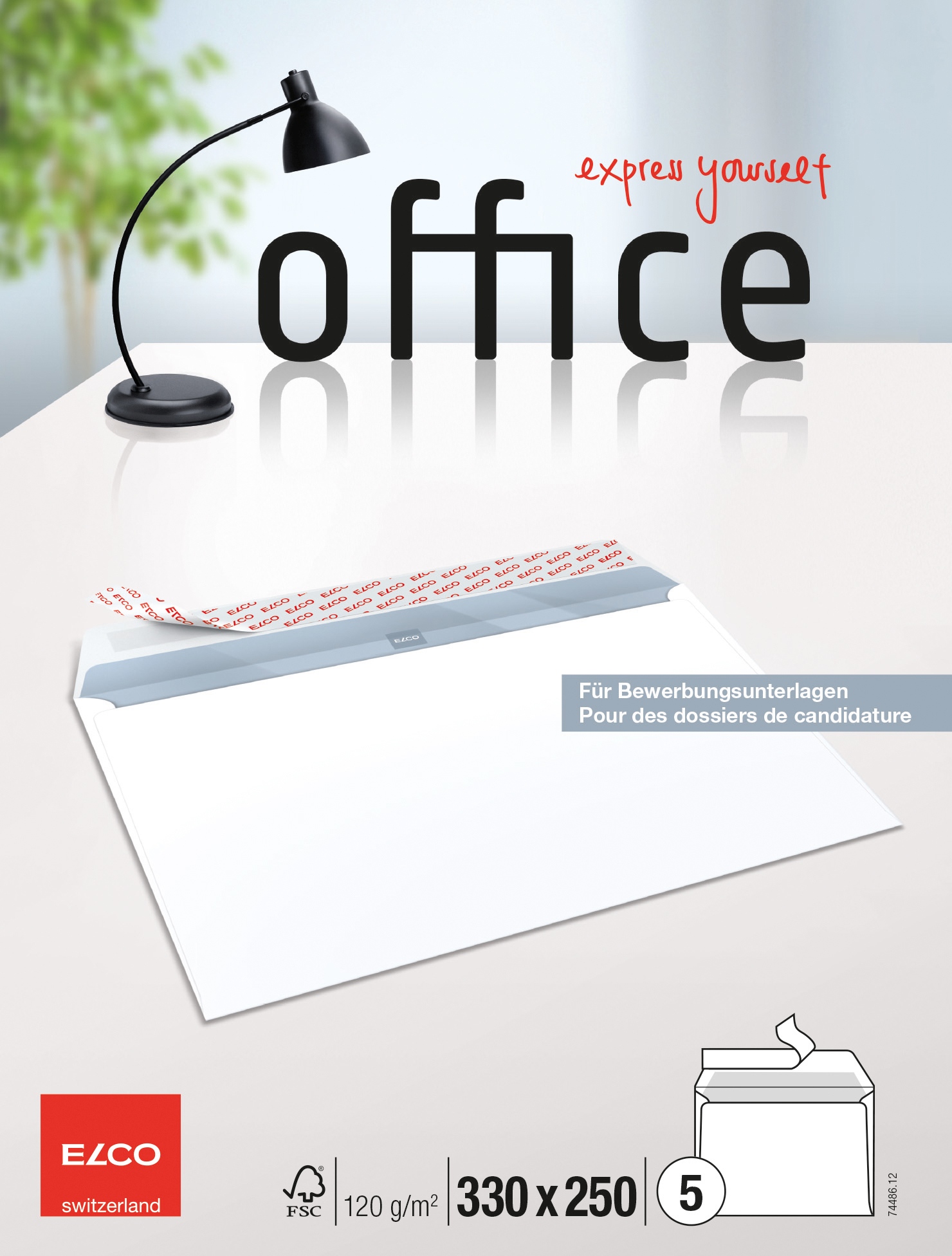 ELCO Briefumschläge Office in Kleinpackung hochweisse Top-Qualität, chlorfrei, grauer Innendruck aus 100% Wasserfarbe. Nachhaltigkeit eco:plus: recyclingfähig. Zertifikat: FSC. für Bewerbungen, mit Optifix® Haftklebeverschluss 330 x 250 mm, Façon DNG-HK. Cello-Zip zu 5 Stück. 120 g/m2