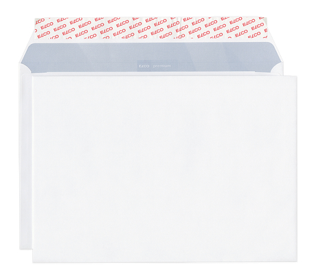 ELCO Briefumschläge Office in Bürokleinpackung hochweisse Top-Qualität, chlorfrei, grauer Innendruck aus 100% Wasserfarbe. Nachhaltigkeit eco:plus: recyclingfähig. Zertifikat: FSC. C4, mit Optifix® Haftklebeverschluss 324 x 229 mm, Façon DNG-HK. Schachtel zu 50 Stück. 120 g/m2
