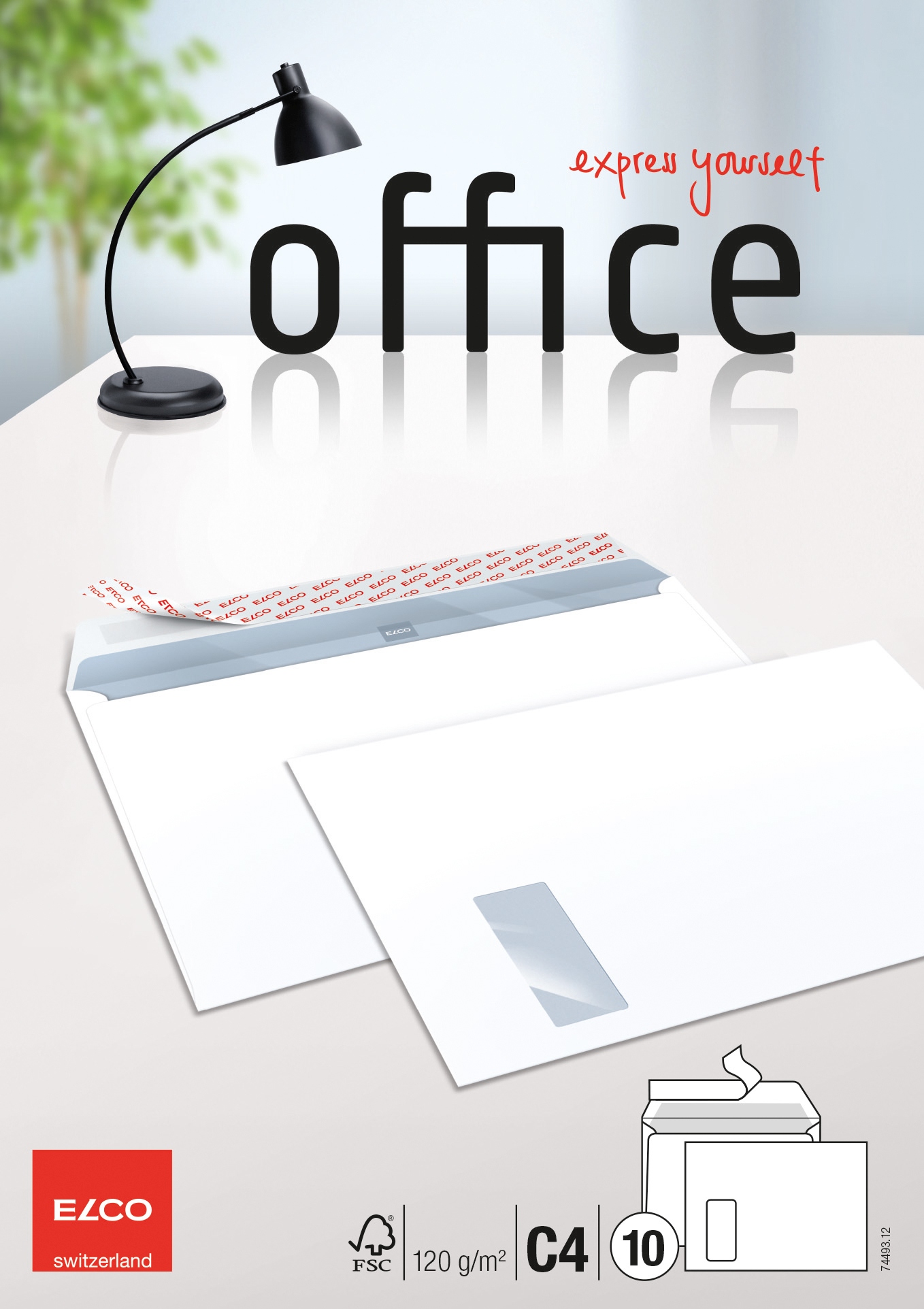 ELCO Briefumschläge Office in Kleinpackung hochweisse Top-Qualität, chlorfrei, grauer Innendruck aus 100% Wasserfarbe. Nachhaltigkeit eco:plus: recyclingfähig. Zertifikat: FSC. C4, mit Optifix® Haftklebeverschluss 324 x 229 mm, Façon DNG-HK. Cello-Zip zu 10 Stück. 120 g/m2 Fenster links