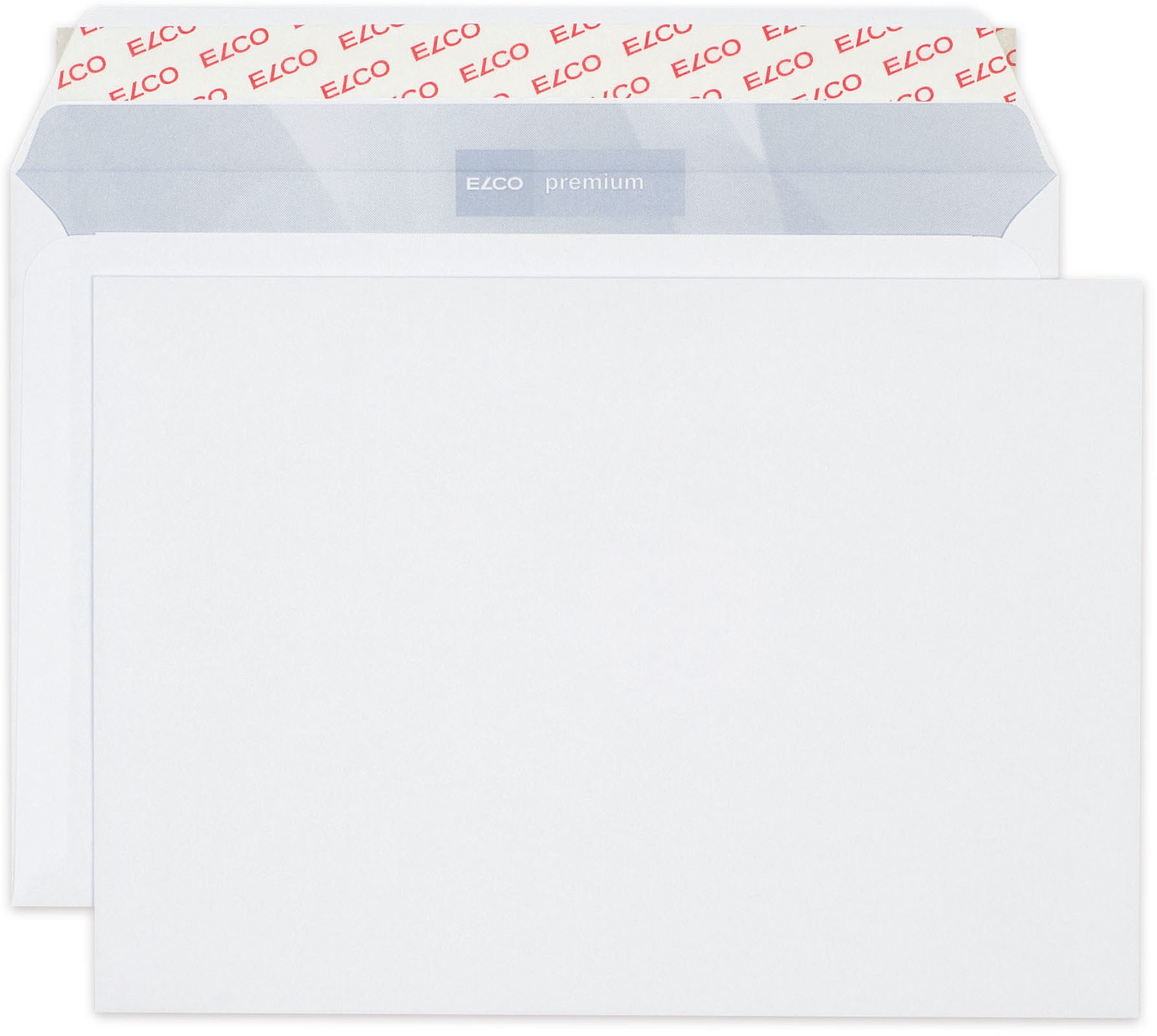 ELCO Briefumschläge Office in Bürokleinpackung hochweisse Top-Qualität, chlorfrei, grauer Innendruck aus 100% Wasserfarbe. Nachhaltigkeit eco:plus: recyclingfähig. Zertifikat: FSC. C5, mit Optifix® Haftklebeverschluss 229 x 162 mm, Façon DNG-HK. Schachtel zu 100 Stück. 100 g/m2