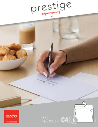 ELCO hochwertige Briefumschläge Prestige in Kleinpackung weiss, ohne Innendruck. Nachhaltigkeit eco:plus: recyclingfähig. Zertifikat: FSC. C4, mit Haftklebeverschluss 324 x 229 mm, Façon DNG-HK. Cello-Zip zu 5 Stück. 120 g/m2