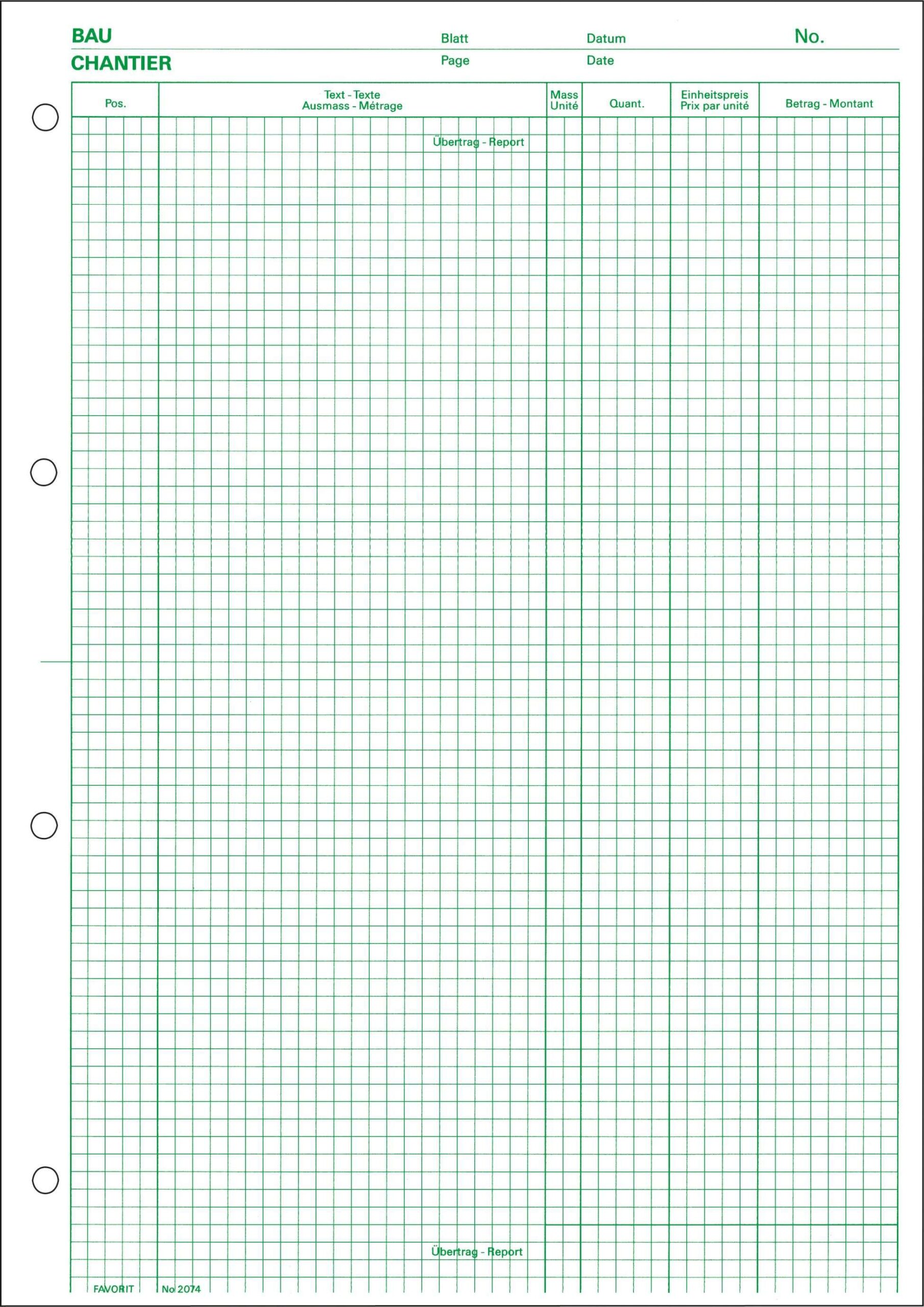 FAVORIT Devis-Ausmassblock grün kariert mit Devis-Druck, 100 Blatt, 4 Loch. Nachhaltigkeit eco:plus: zerlegbar konstruiert, recyclingfähig. ohne Deckblatt geleimt. A4 4 mm kariert d/f