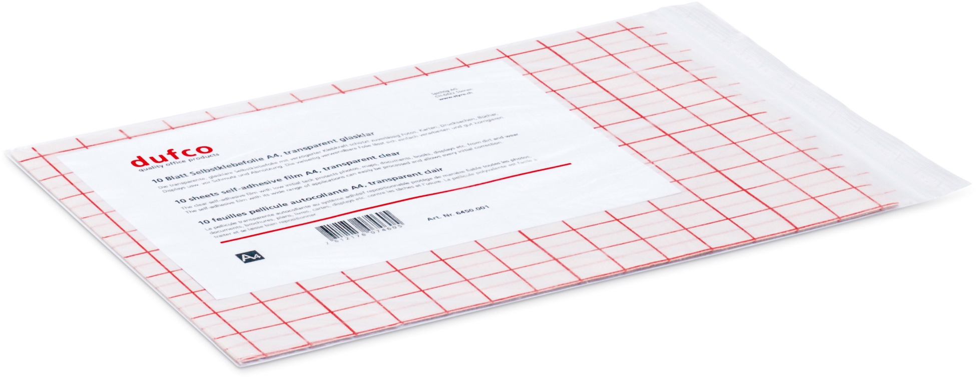 DUFCO Selbstklebefolie aus PVC, 90 Micron, glasklar, mit verzögerter Klebkraft, schützt zuverlässig, vielseitig einsetzbar, lässt sich einfach verarbeiten und gut korrigieren, geeignet für Fotos, Karten, Drucksachen, Bücher, Displays etc. Packung zu 10 Blatt. A4