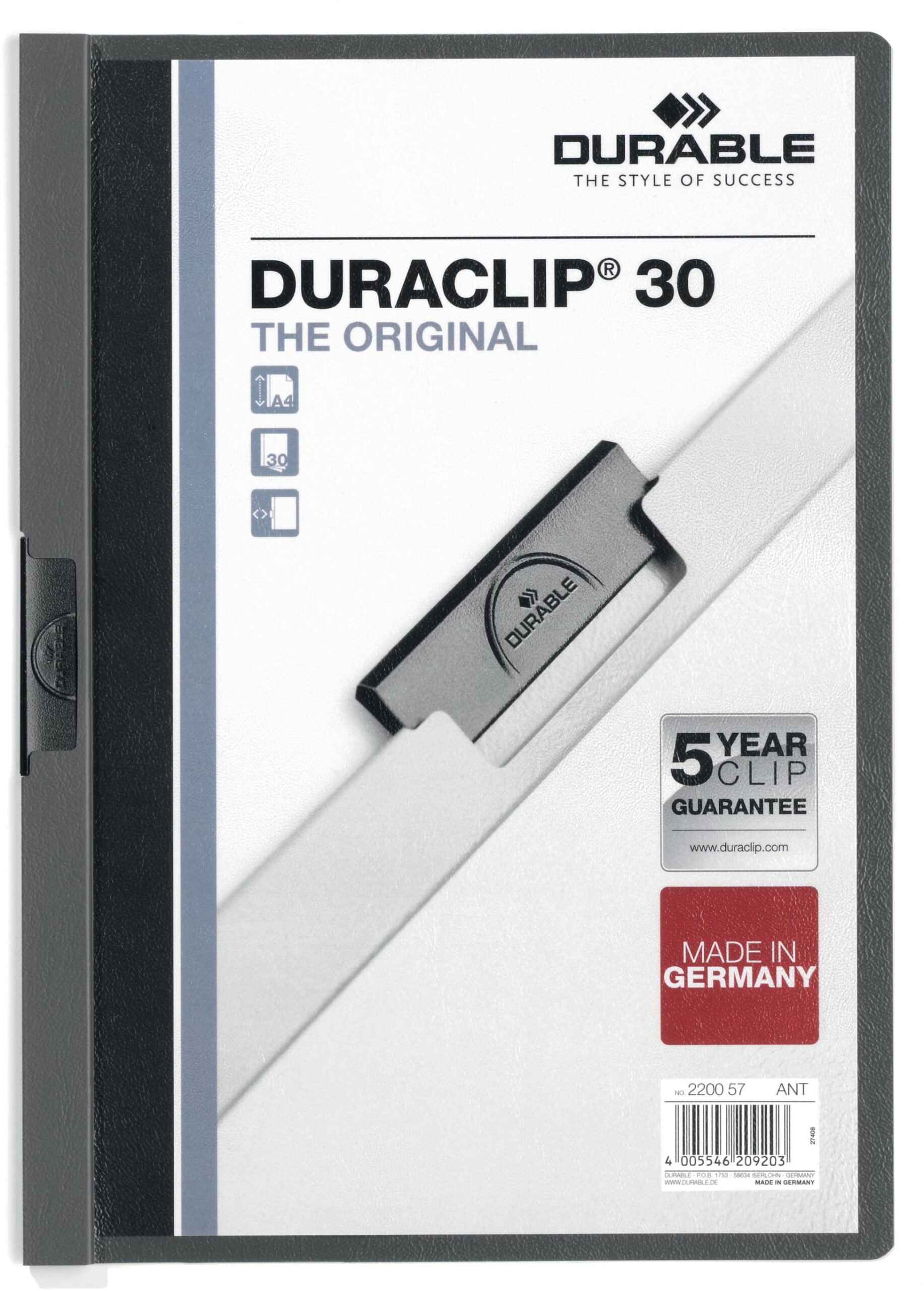 DURABLE Klemmhefter Duraclip® 30 für ungelochtes Schriftgut, Vorderdeckel transparente Hartfolie, Rückendeckel farbig, Klemme aus Stahl, Fassungsvermögen bis 30 Blatt 80 g/m2. Garantie: 5 Jahre auf die Klemme. Nachhaltigkeit eco:plus: recyclingfähig, recycelter Bestandteil, Recycelgehalt Abfall vor Gebrauch max. 5%, Recycelgehalt Abfall nach Gebrauch max. 2%. für Format A4 anthrazit
