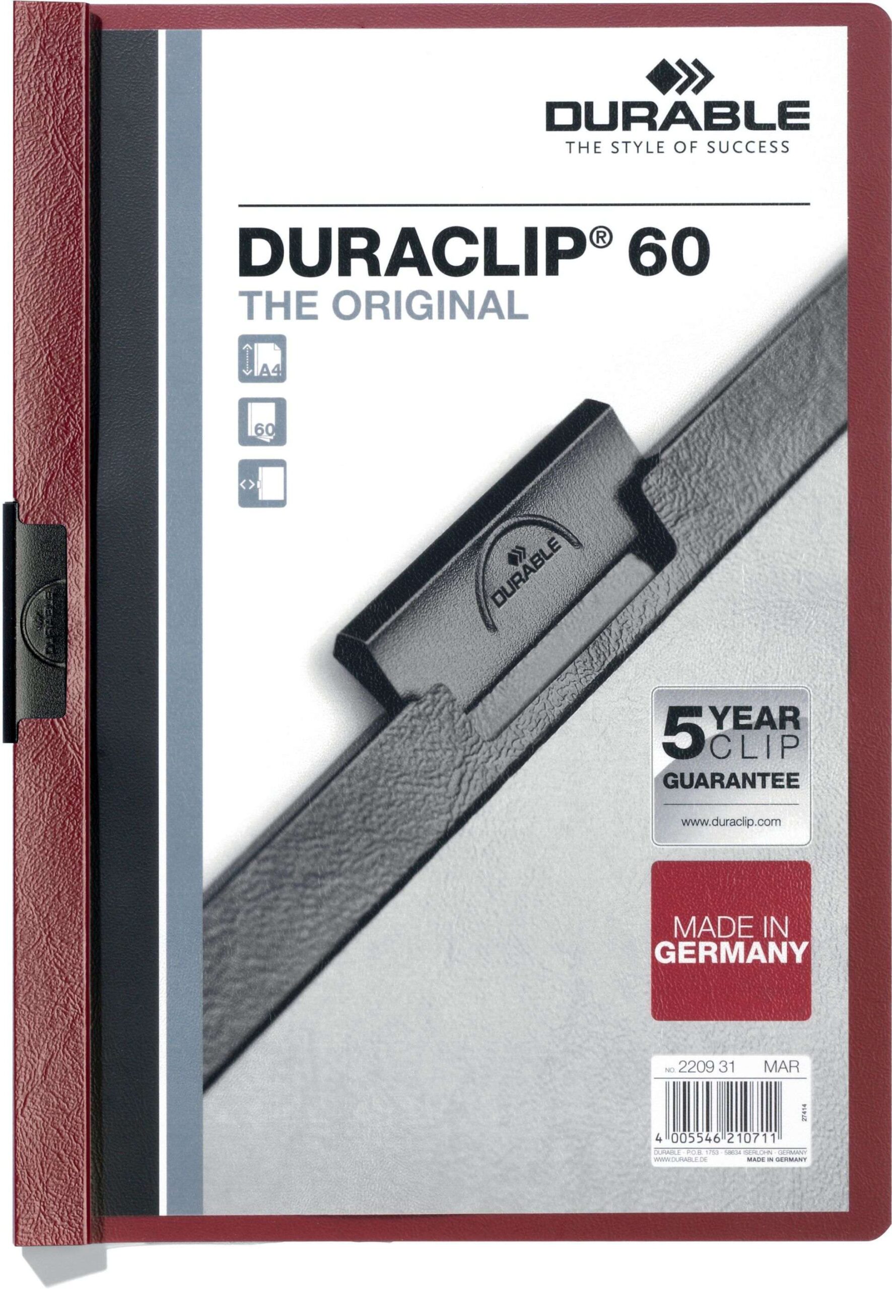 DURABLE Klemmhefter Duraclip® 60 für ungelochtes Schriftgut, Vorderdeckel transparente Hartfolie, Rückendeckel farbig, Klemme aus Stahl, Fassungsvermögen bis 60 Blatt 80 g/m2, für Format A4. Garantie: 5 Jahre auf die Klemme. Nachhaltigkeit eco:plus: recyclingfähig, recycelter Bestandteil, Recycelgehalt Abfall vor Gebrauch max. 5%, Recycelgehalt Abfall nach Gebrauch max. 2%. aubergine