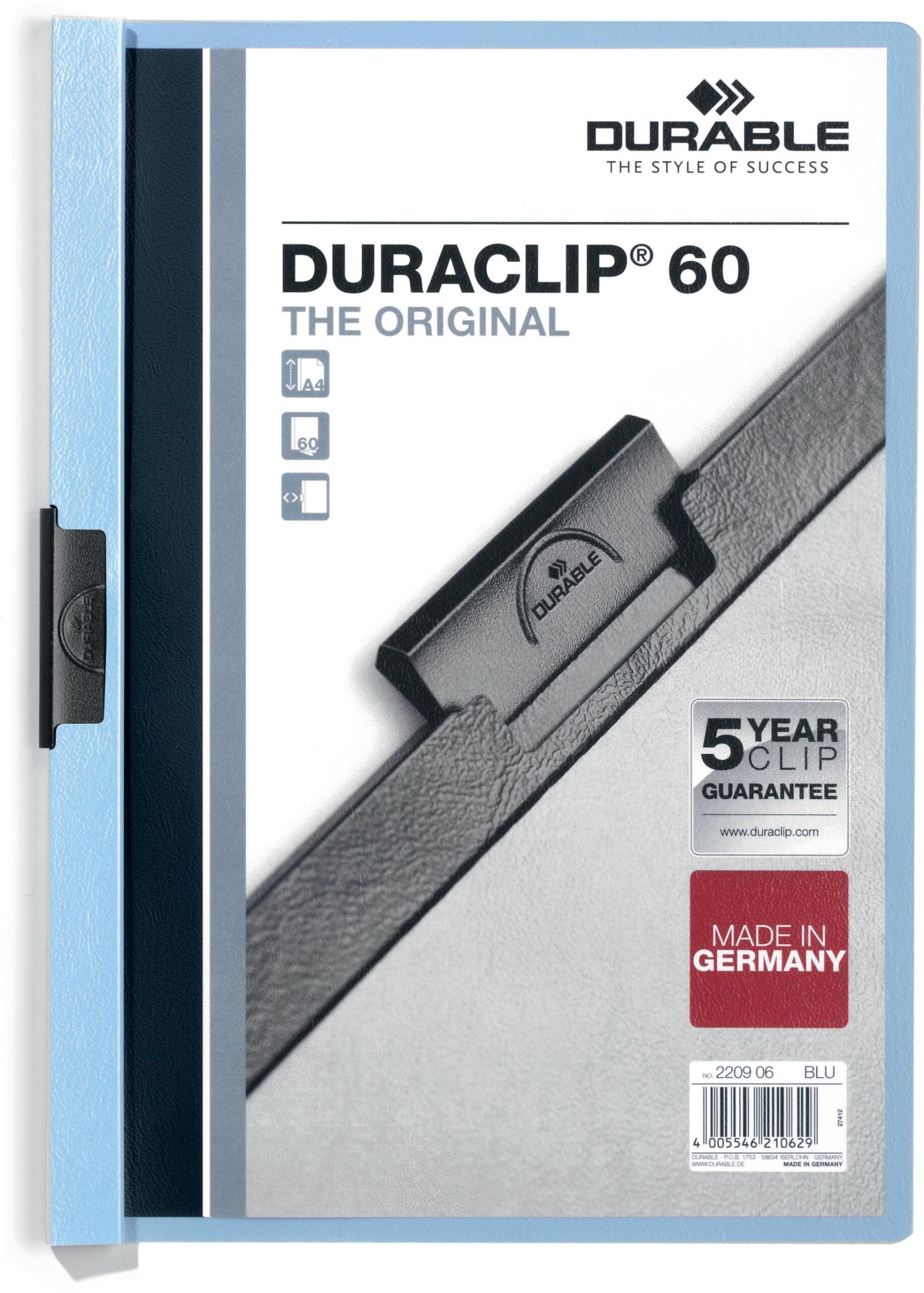 DURABLE Klemmhefter Duraclip® 60 für ungelochtes Schriftgut, Vorderdeckel transparente Hartfolie, Rückendeckel farbig, Klemme aus Stahl, Fassungsvermögen bis 60 Blatt 80 g/m2, für Format A4. Garantie: 5 Jahre auf die Klemme. Nachhaltigkeit eco:plus: recyclingfähig, recycelter Bestandteil, Recycelgehalt Abfall vor Gebrauch max. 5%, Recycelgehalt Abfall nach Gebrauch max. 2%. hellblau