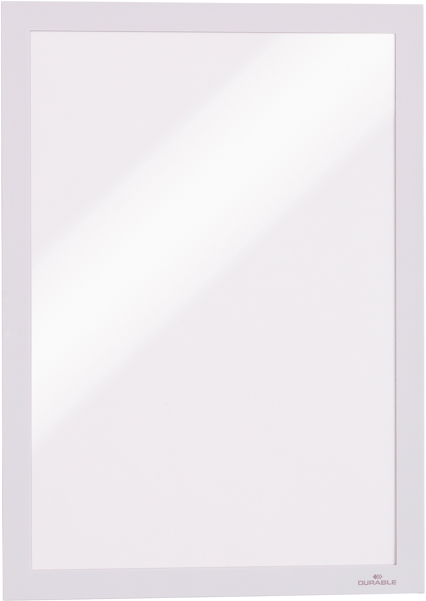 DURABLE Info-Rahmen Duraframe® selbstklebend, mit aufklappbarer, magnetischer Vorderseite für schnelles und bequemes Einlegen und Wechseln von Informationen, haftet dauerhaft auf allen gängigen Oberflächen und kann von glatten und festen Untergründen wie z. B. Glas wieder entfernt und neu angebracht werden, geeignet für Raumkennzeichnungen, Orientierungsinformationen, Angebote etc., doppelseitige Lesbarkeit, einsetzbar im Hoch- und Querformat. Packung zu 2 Stück. A4 weiss