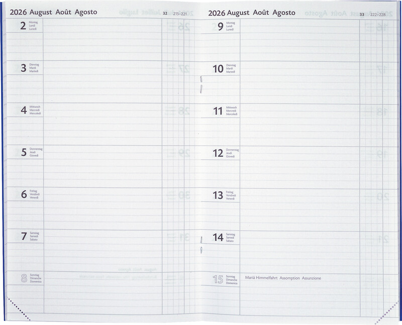 BIELLA Geschäftsagenda Compact 1 Woche pro Seite, Einband aus Karton, Kalendarium dreisprachig d/f/i, zusätzliche Jahres-, Monats- und Notizseiten, Eckenperforation, Format 15 x 24 cm. Nachhaltigkeit eco:plus: Zertifikat: PEFC. dunkelblau Jahrgang 2026
