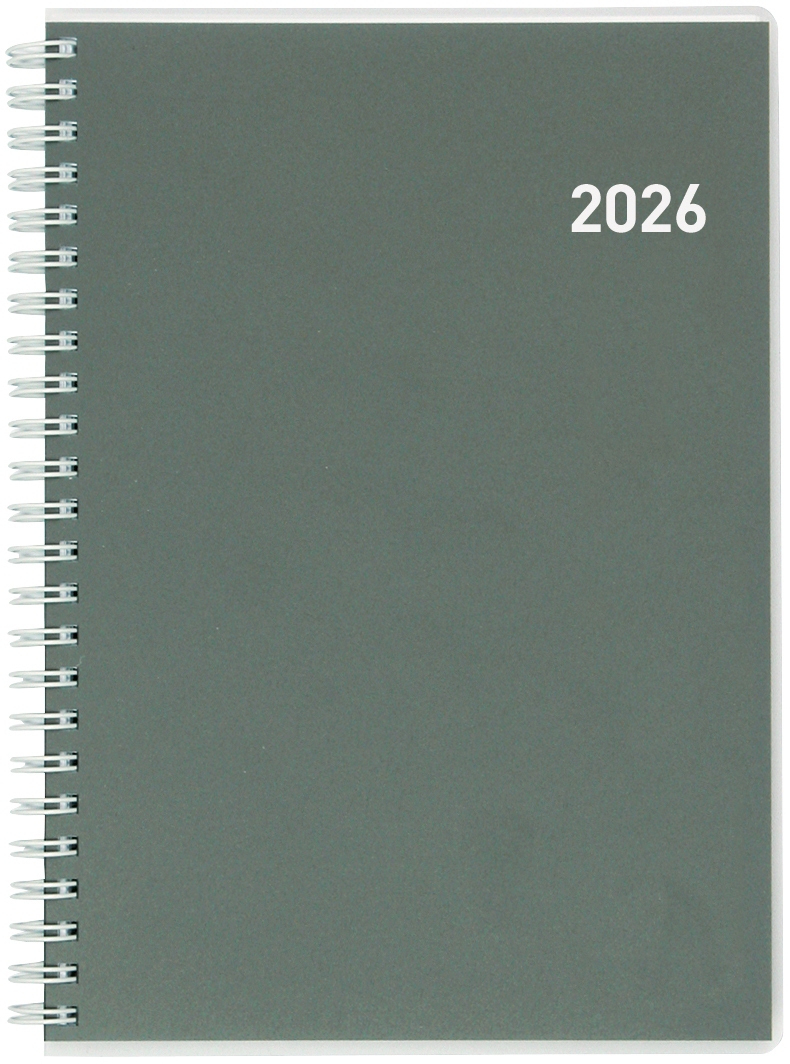 BIELLA Geschäftsagenda Terminia Wire-O 1 Woche auf 2 Seiten, Einband aus PP Cylar®, Kalendarium viersprachig d/f/i/gb, querliniert, Stunden-Einteilung (07.00 – 20.00 Uhr), zusätzliche Jahres-, Monats- und Notizseiten, jede Seite mit Monatsübersicht, Eckenperforation, Wire-O-Bindung, Format 14,5 x 20,5 cm. Nachhaltigkeit eco:plus: Zertifikat: FSC. grau Jahrgang 2026