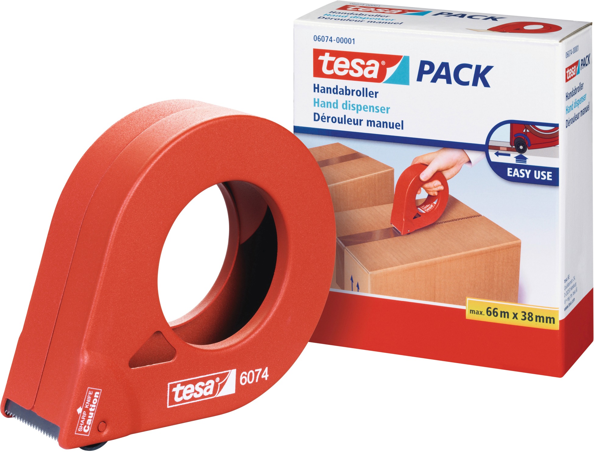TESA® Verpackungsbandabroller robustes Metallgehäuse, mit manueller Rollenbremse, orange, bis 66 m Rollenlänge. bis max. 38 mm Rollenbreite