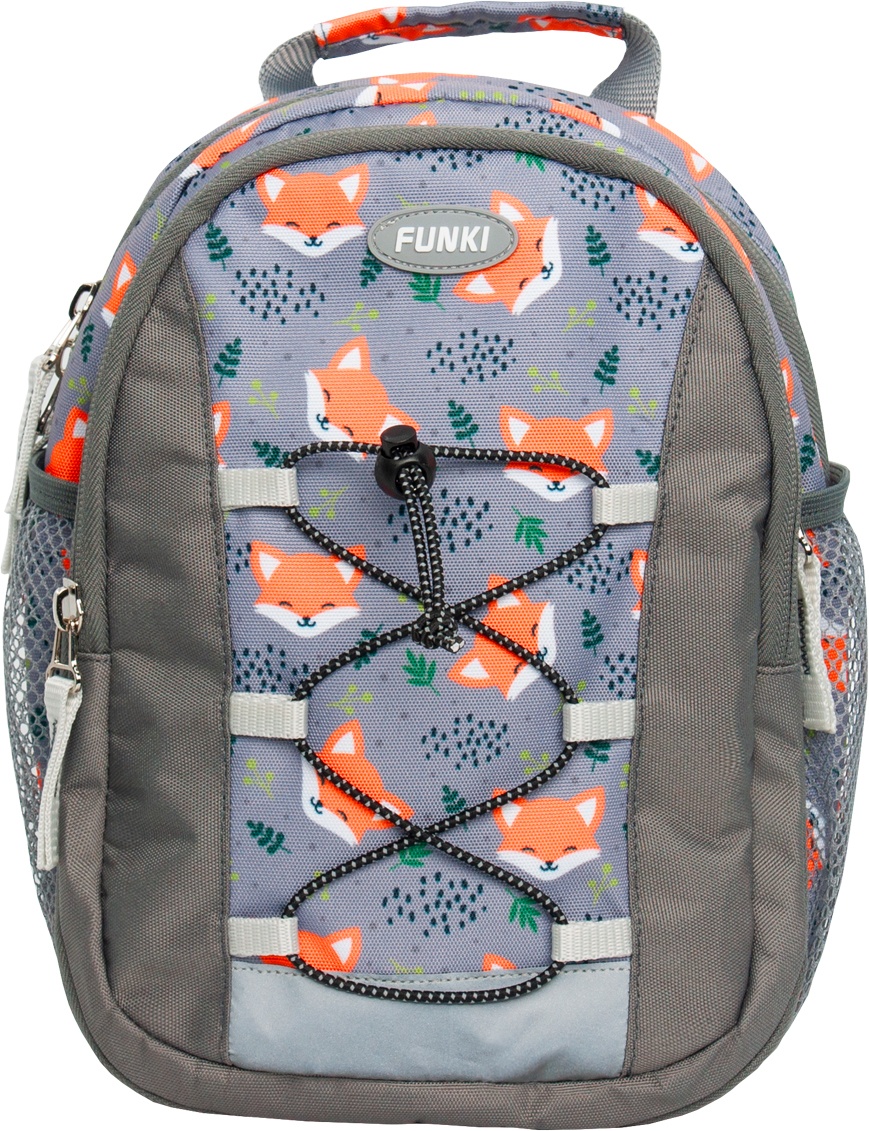 FUNKI(TM) Kindergartenrucksack Raumwunder aus PES, grosses Hauptfach mit Reissverschluss, 2 seitliche Netztaschen, Fronttasche mit Vergrösserungsfunktion, kleines Reissverschlussfach für Namensbeschriftung in der Fronttasche, mit verstellbaren, gepolsterten und ergonomisch geformten Schultergurten, höhenverstellbarer Brustgurt, Reflexstreifen vorne und auf den Schultergurten, Befestigungsbänder für Jacke, Pullover oder Fahrradhelm, Tragegriff, wasserabweisend, Volumen 8 – 11 l. Masse: B 250 x H 280 x T 110/150 mm. Gewicht: 275 g. Little Fox