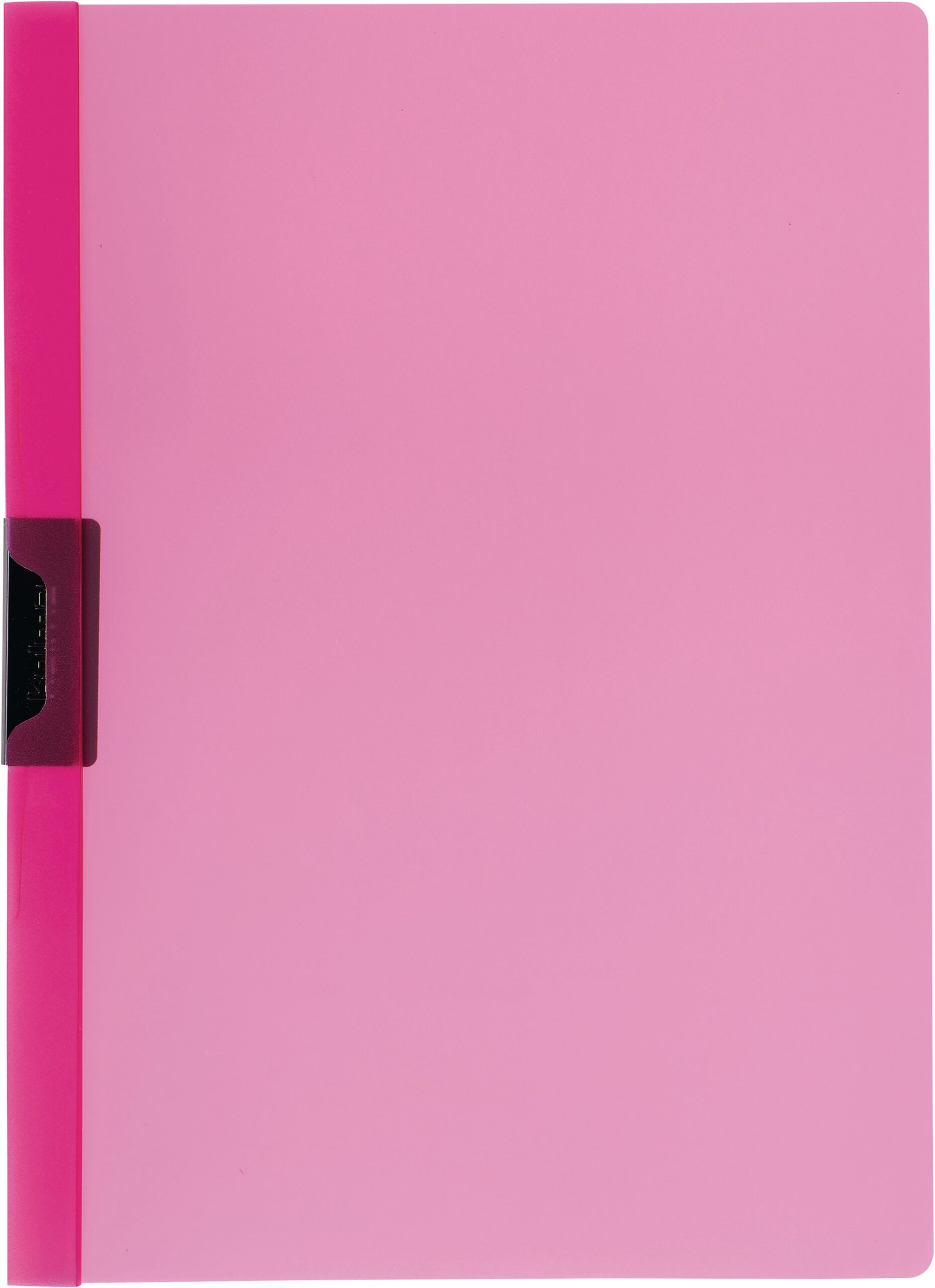 KOLMA easy Klemmhefter PressQuick aus halbtransparentem KolmaFlex Material, blendfreies Deckblatt, schwarze Federstahlklemme, Fassungsvermögen bis 30 Blatt 80 g/m2, für Format A4. Nachhaltigkeit eco:plus: recyclingfähig, Recycelgehalt Abfall nach Gebrauch max. 100%. berry