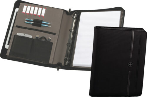 WENGER® Konferenzmappe Affiliate aus Nylon, kratzsicheres Material, mit Reissverschluss, Fach für Tablets bis Grösse 10′, mit Organizer, herausnehmbare 4-Ring-Mechanik Ø 25 mm, Blockhalterung inkl. Schreibblock, 6 Kartenfächer, 2 Organizerfächer, Reissverschlussfach innen, 2 Schreibgerätehalterungen, für Format A4. Masse: B 260 x H 350 x T 50 mm. Garantie: 3 Jahre. schwarz