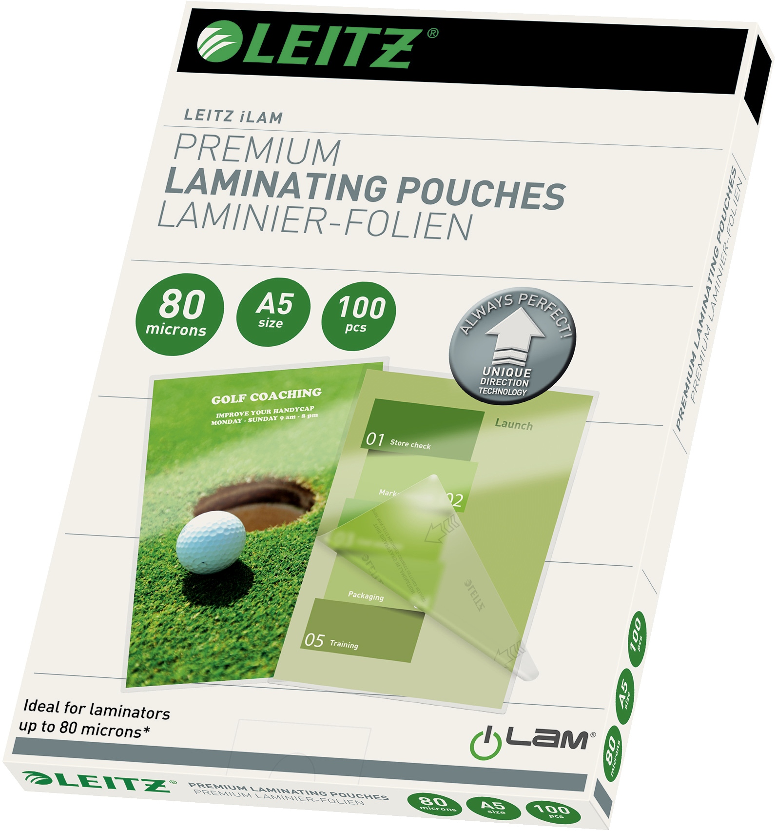 LEITZ® Laminierfolien iLAM UDT auf 3 Seiten offen, einfaches und perfektes Laminieren mit der Unique Direction Technology, einfache Verwendung, da die Einlegerichtung vorgegeben ist, Laminieren ohne Folienstau ist dadurch garantiert, einwandfreies Verschliessen der Folie. UDT: die patentierten Pfeile geben die Einlegerichtung vor und verschwinden während dem Laminiervorgang. Grösse A5, 153 x 216 mm 80 Micron 100 Stück