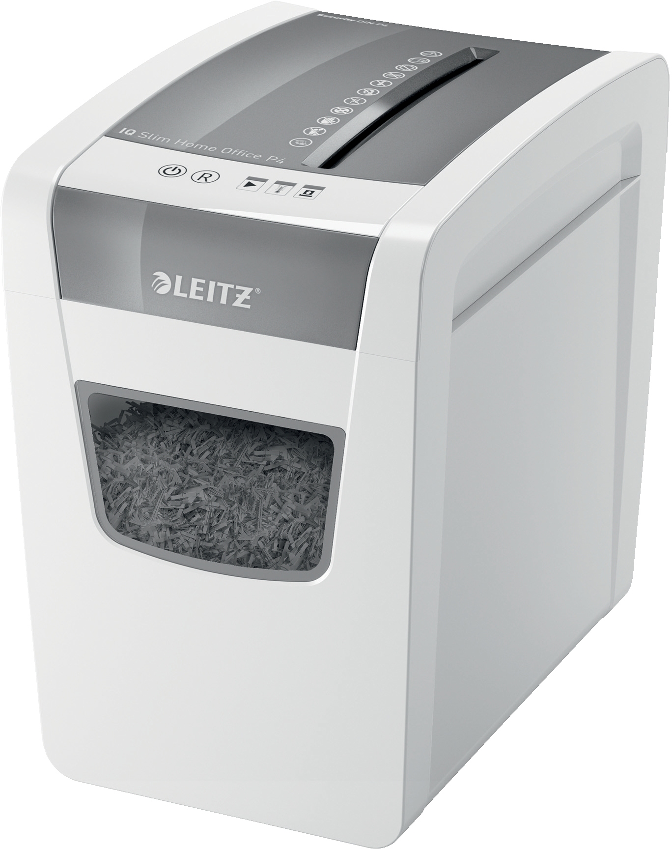 LEITZ® Aktenvernichter IQ Slim Home Office 23 l Auffangbehälter mit Sichtfenster, volle DIN A4-Arbeitsbreite von 220 mm, Sicherheitsstufe P-4, schneidet bis zu 10 Blatt pro Vorgang, 6 Min. pausenloses Schreddern, vernichtet Heft- und Büroklammern, Motorleistung: 280 W, einfache, intuitive Bedienung durch Touch-Control-Tasten, Leuchtanzeige für Abkühlphase, Rücklaufmodus. Masse: B 255 x H 375 x T 370 mm. Gewicht: 6,5 kg. Garantie: 2 + 1* Jahre (*bei Registrierung). Preis inkl. VRG. Zertifikat: CE, TÜV/GS. Partikelschnitt 4 x 28 mm