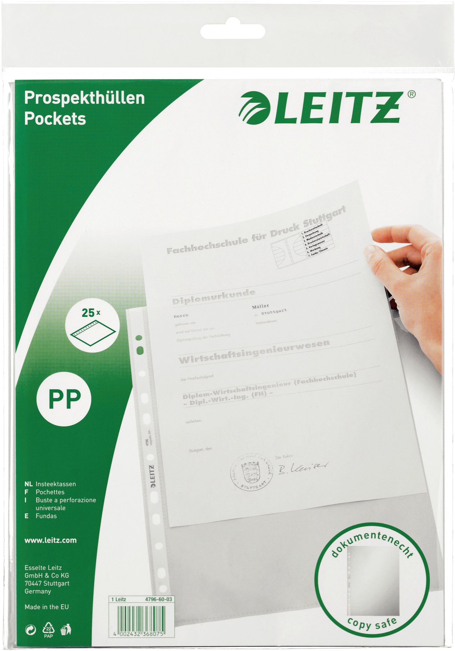 Hochwertige Prospekthülle für den täglichen Gebrauch. Die Universal-Lochung ermöglicht eine bequeme Ablage in Ordnern und Ringbüchern.