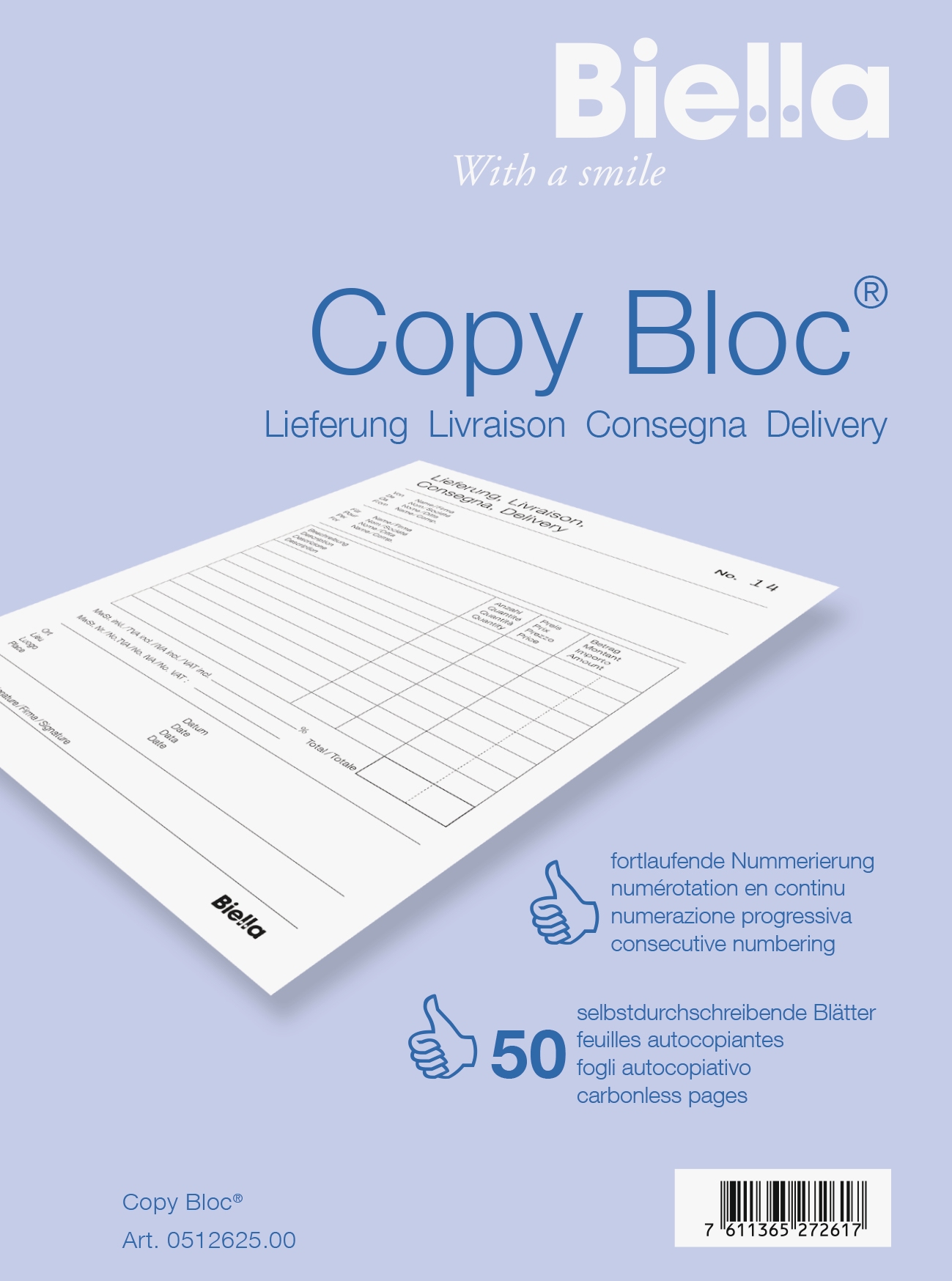 BIELLA Durchschreibeblock Copy Bloc® Lieferschein Papier weiss, selbstdurchschreibend, fortlaufend nummeriert, Vordruck: 1. Blatt schwarz, 2. Blatt blau, Farbe der Blätter w = weiss. Nachhaltigkeit eco:plus: Zertifikat: FSC. A6 50 x 2 w/w d/f/i/gb