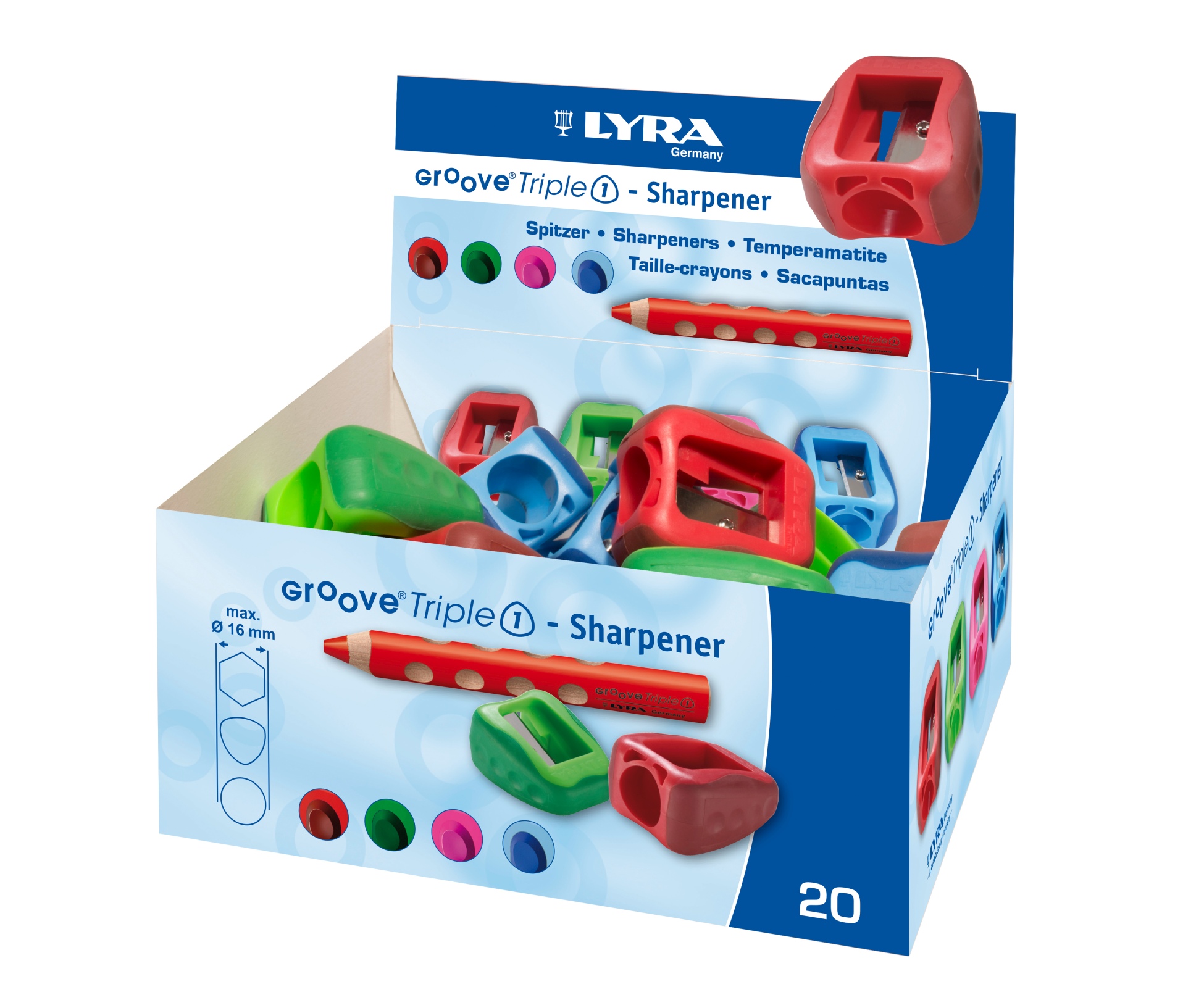 Spitzer aus Kunststoff mit einer Bohrung, speziell für die Buntstifte von Lyra Groove Triple One. Duchmesser 16.5 mm. Mit Klinge bester deutscher Qualität für ein pefektes Spitzergebnis.