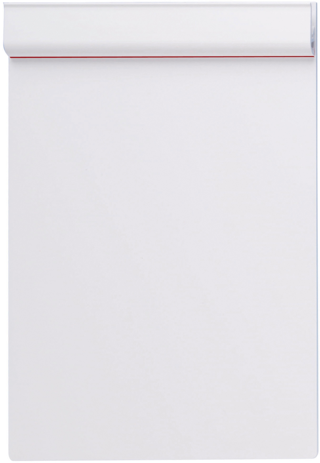 Rote gummiartige Lippe am Klemmer hält das Papier sicher fest. Klemmer aus Kunststoff über die gesamte Breite der Platte mit kräftigen Edelstahlfedern. Aus bruchsicherem Kunststoff. Auch zum Aufhängen. Schadstoffarm gefertigt am Standort Deutschland, recycelbar.