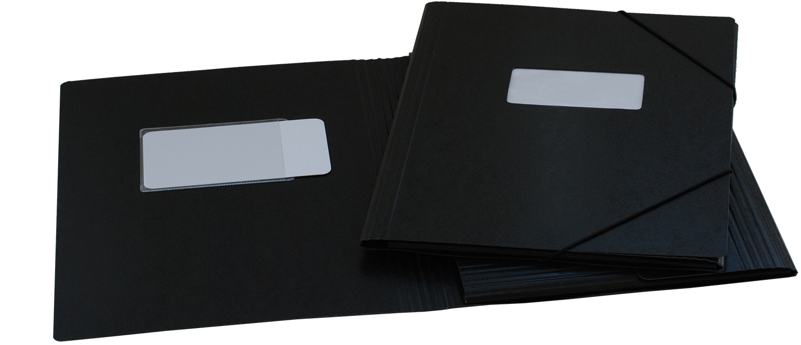 EROLA® Pressspan-Momentordner mit Fenster aus Original Schweizer-Pressspan, mit 3 Einschlagklappen, mit Gummibandverschluss, mit ausgestanztem Etikettenfenster und auswechselbarem Schild, Fassungsvermögen bis 40 mm. Nachhaltigkeit eco:plus: recycelter Bestandteil, umweltfreundliche Verpackung. schwarz