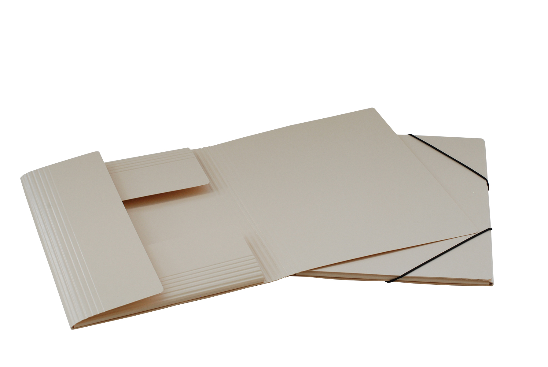 EROLA® Pressspan-Momentordner mit 3 Einschlagklappen aus Original Schweizer-Pressspan, mit Gummibandverschluss. Nachhaltigkeit eco:plus: recyclingfähig. Format A4, Pressspan 0,7 mm Fassungsvermögen 45 mm. chamois