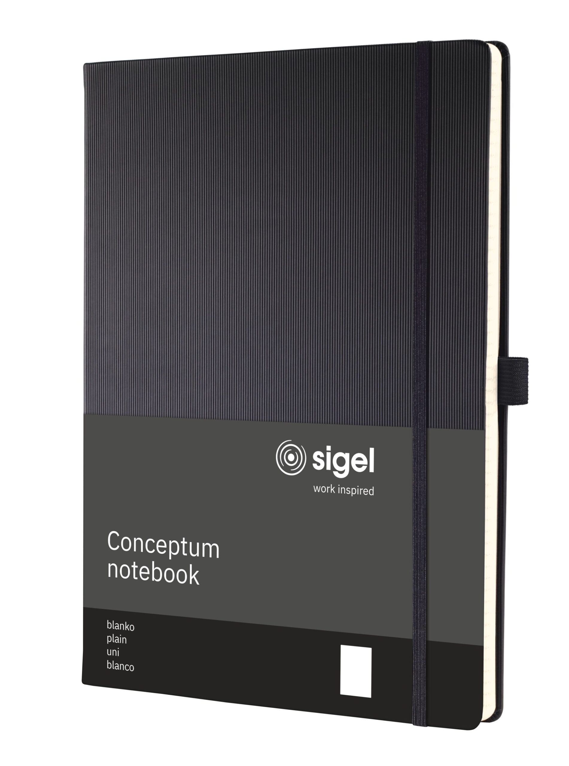 SIGEL Notizbuch Conceptum Hardcover Einband mit Softwave-Oberfläche, Papier chamois, 80 g/m2, 194 Seiten nummeriert, davon 20 Blatt zusätzlich perforiert, Inhaltsverzeichnis, 2 Zeichenbänder, Archivtasche mit Kartenfach für bis zu 10 Visitenkarten, Quickpocket, Stiftschlaufe, Gummibandverschluss. Nachhaltigkeit eco:plus: recyclingfähig. Zertifikat: PEFC. ca. Format A4 blanko schwarz