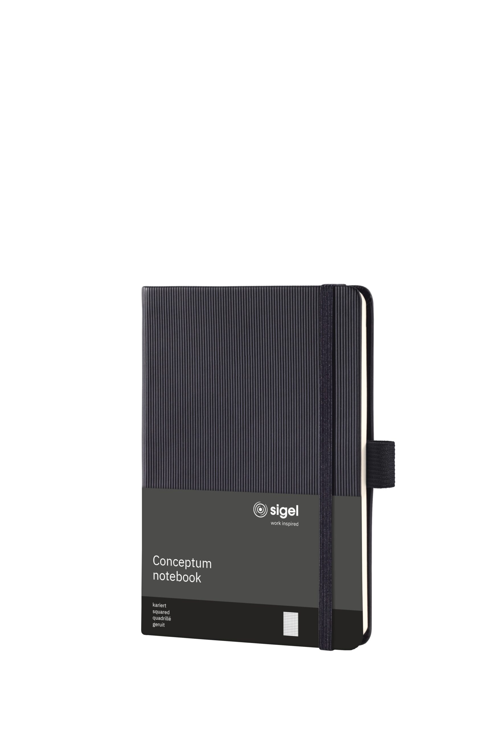 SIGEL Notizbuch Conceptum Hardcover Einband mit Softwave-Oberfläche, Papier chamois, 80 g/m2, 194 Seiten nummeriert, davon 20 Blatt zusätzlich perforiert, Inhaltsverzeichnis, 2 Zeichenbänder, Archivtasche mit Kartenfach für bis zu 10 Visitenkarten, Quickpocket, Stiftschlaufe, Gummibandverschluss. Nachhaltigkeit eco:plus: recyclingfähig. Zertifikat: PEFC. ca. Format A6 5 mm kariert schwarz