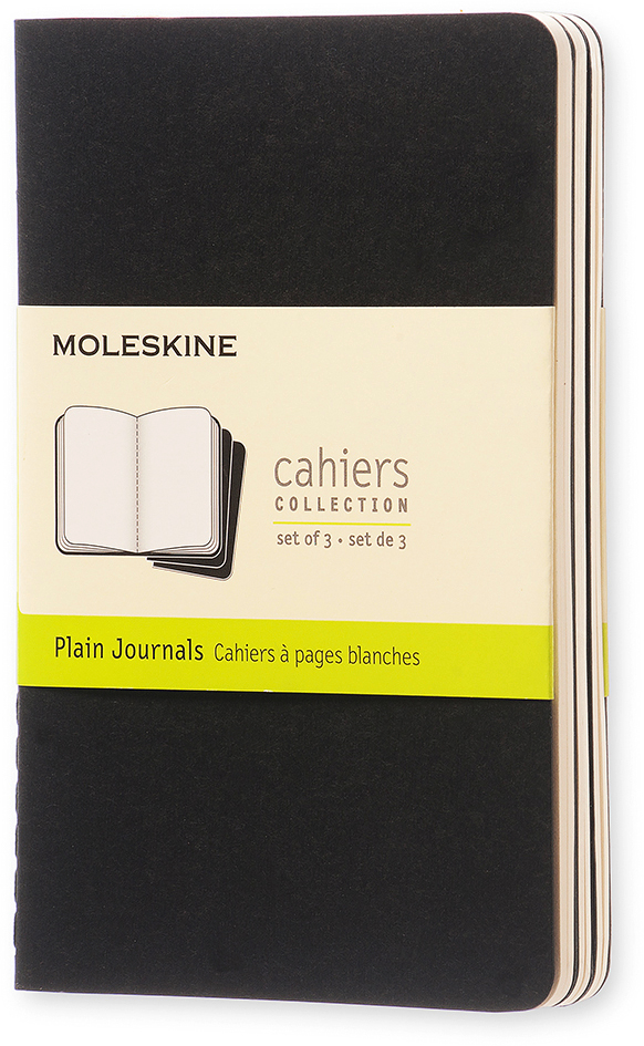 MOLESKINE® Notizhefte Cahiers Collection abgerundete Ecken, säurefreies Papier, 70 g/m2, sichtbare Fadenheftung am Rücken, mit grosser Innentasche für lose Notizzettel. Packung zu 3 Stück. Nachhaltigkeit eco:plus: Recycelgehalt Abfall nach Gebrauch max. 50%. Zertifikat: FSC. Pocket 90 x 140 mm, Kartoneinband, 64 Seiten die letzten 16 Seiten sind heraustrennbar. blanko schwarz