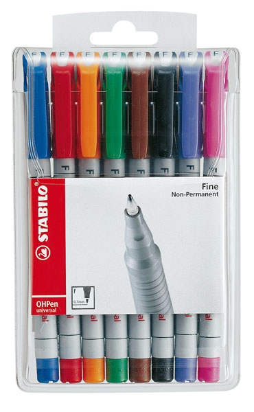 STABILO® OHPen universal wasserlöslich Clip, universell einsetzbarer Folienschreiber, nicht nur für Folien geeignet, sondern auch für den Einsatz auf fast allen glatten Oberflächen, wasserlösliche Tinte, feucht abwischbar, nicht nachfüllbar. Nachhaltigkeit eco:plus: umweltfreundliche Verpackung. fein (F), Strichbreite ca. 0,7 mm 8er Etui (rot, blau, grün, schwarz, orange, braun, pink, violett)