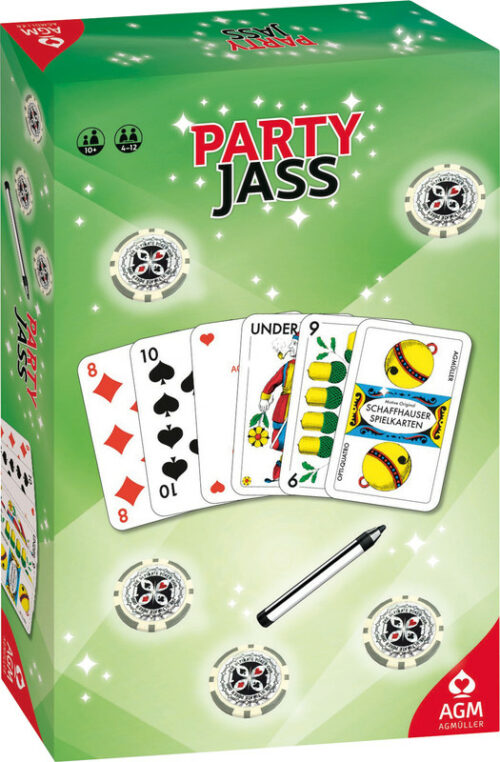 AGM® Jasskarten Party Jass 4 – 12 Spieler, ab 10 Jahren, d/f/i. Ob du beim «Hose Abe» alle Pokerchips verlierst, beim «Arschlöchle» Striche auf die Stirn bekommst, als Esel auf der Strecke bleibst oder beim «Gämsch» das geheimnisvollste Zeichen erfindest, diese Spiele eignen sich für jede Party, die Regeln sind genial einfach und auch für Nichtjasser geeignet. Inhalt: 36 extra grosse Party-Jasskarten, hochwertige Pokerchips und Facepaint-Stift. Masse: B 150 x H 224 x T 45 mm. Nachhaltigkeit eco:plus: recyclingfähig, Recycelgehalt Abfall vor Gebrauch max. 100%, Recycelgehalt Abfall nach Gebrauch max. 100%, Abfallminderung, umweltfreundliche Verpackung.