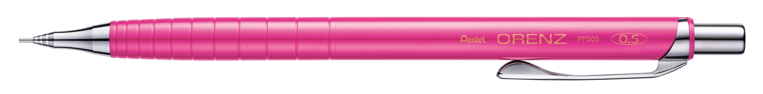 PENTEL Druckbleistift Orenz Metallclip, Anti Minenbruch System, einmal klicken um die Mine hervorzuschieben, Führungsrohr gleitet während dem Schreiben automatisch mit der Mine zurück, sobald das Führungsrohr hinten angekommen ist, einmal klicken um die Führung wieder vorzuschieben, Radierer. für 0,5 mm Minen pink