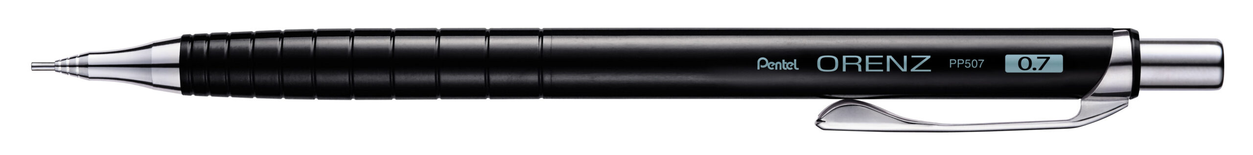 PENTEL Druckbleistift Orenz Metallclip, Anti Minenbruch System, einmal klicken um die Mine hervorzuschieben, Führungsrohr gleitet während dem Schreiben automatisch mit der Mine zurück, sobald das Führungsrohr hinten angekommen ist, einmal klicken um die Führung wieder vorzuschieben, Radierer. für 0,7 mm Minen schwarz