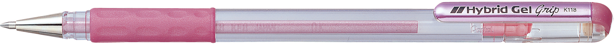 PENTEL Roller Hybrid Gel Grip Schaft transparent, Kugelspitze, gummierte rutschfeste, gummierte Griffzone in der Schreibfarbe, Kappe mit Clip, deckende Gel-Pigmenttinte, lichtbeständig, wasserfest, nicht nachfüllbar, Strichbreite 0,8 mm. pink metallic