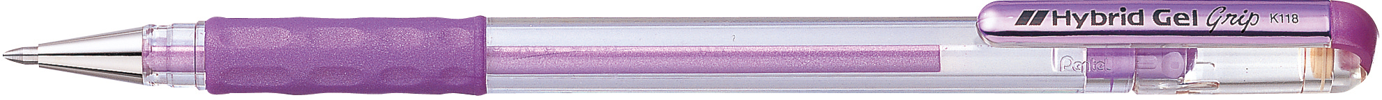 PENTEL Roller Hybrid Gel Grip Schaft transparent, Kugelspitze, gummierte rutschfeste, gummierte Griffzone in der Schreibfarbe, Kappe mit Clip, deckende Gel-Pigmenttinte, lichtbeständig, wasserfest, nicht nachfüllbar, Strichbreite 0,8 mm. violett metallic
