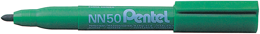PENTEL Permanent Marker Green-Label NN50 konische Spitze, Clip, wasserfest, nicht nachfüllbar, Strichbreite ca. 1,3 mm. Nachhaltigkeit eco:plus: recycelter Bestandteil, Recycelgehalt Abfall vor Gebrauch max. 85%. grün