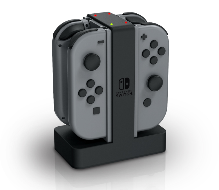The Joy-Con Charging Dock is the easiest solution for charging your Nintendo Switch Joy-Con Controllers. Charge 4 Joy-Con Controllers at a time for multiple players, or keep an extra pair charged for single players to switch out. Simply slide the Joy-Con Controllers down and wait until each charge LED turns green!
