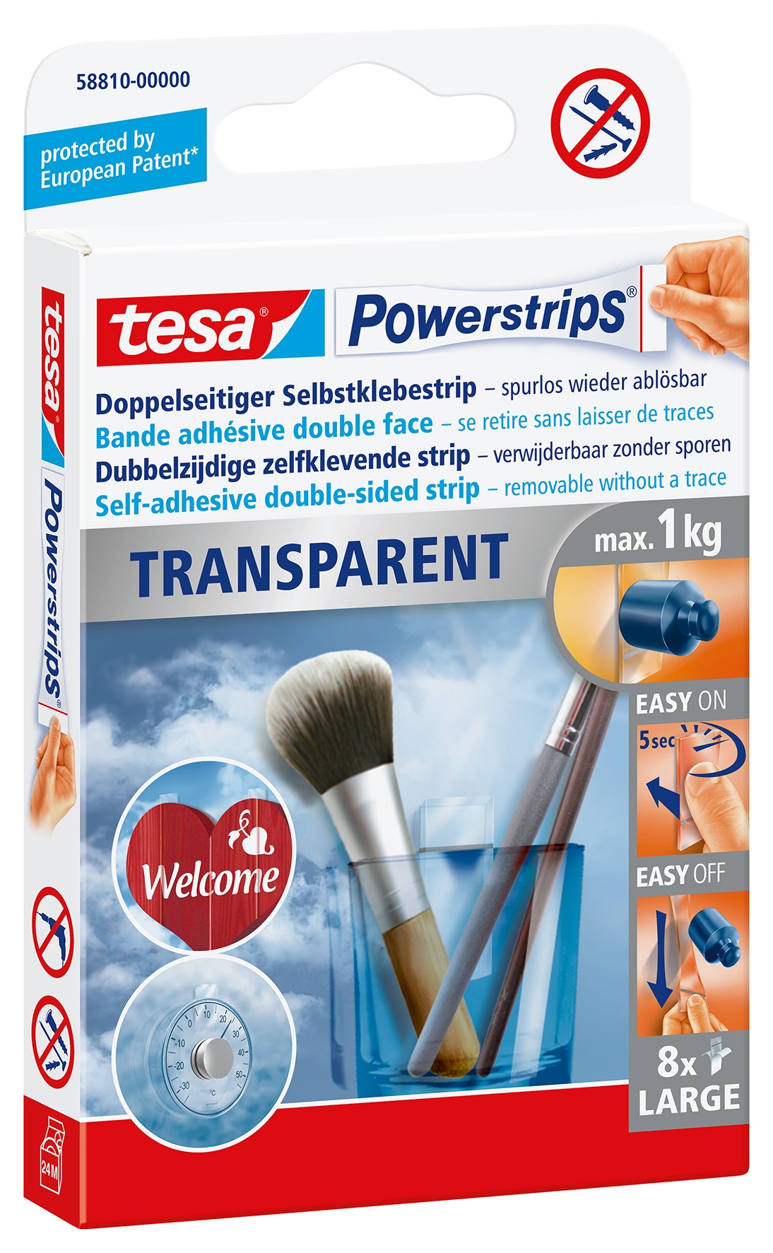 TESA® Powerstrips® Transparent Large transparenter Klebestreifen, begrenzt UV-beständig, beidseitig klebend, unsichtbarer Halt, zum Dekorieren von Fenstern, Glas und Spiegeln mit leichten und flachen Gegenständen wie z. B. Fotos, Postern, Karton- und Papierdekorationen, spurlos ablösbar, Belastbarkeit bis 1 kg. Packung zu 8 Powerstrips®. transparent