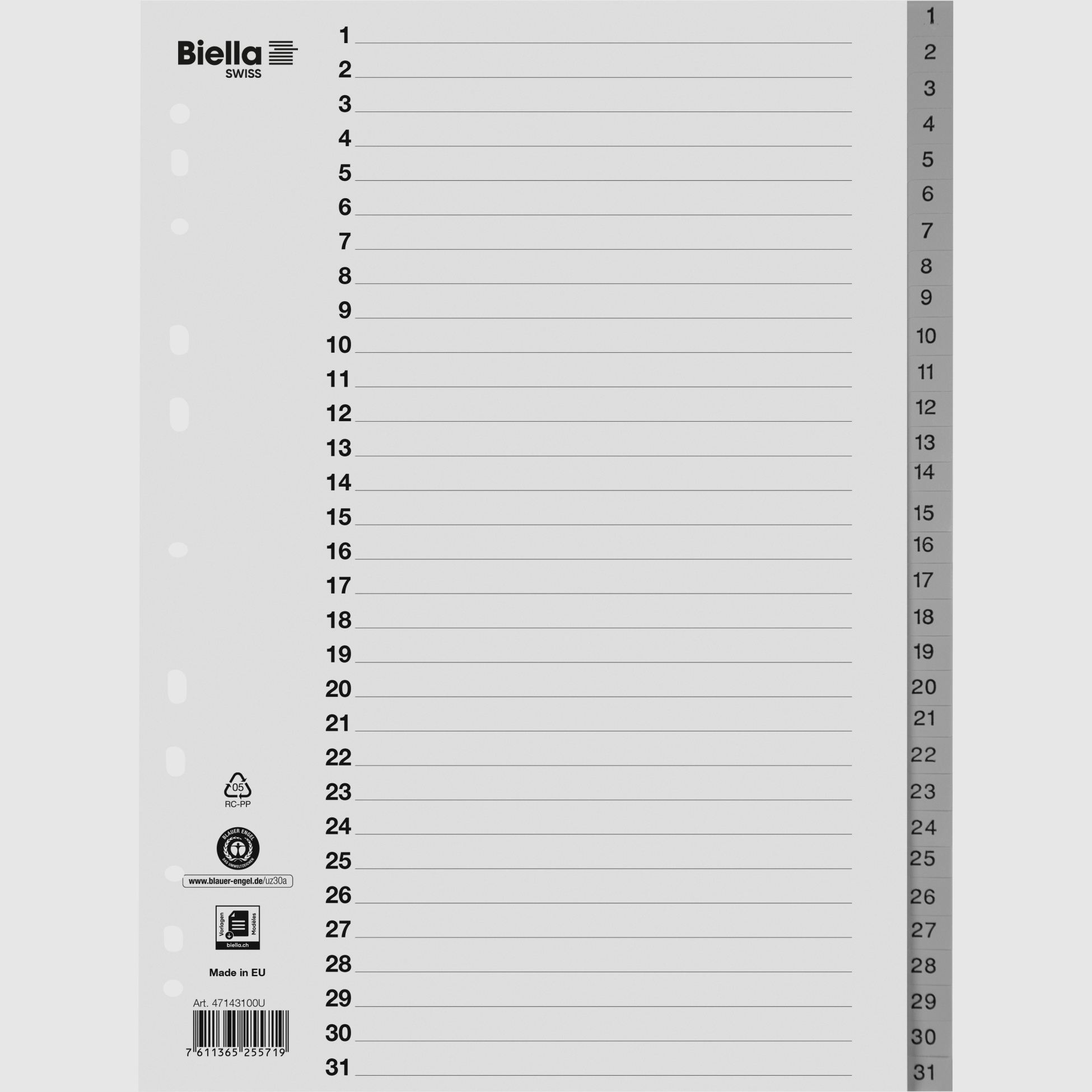 WunschlisteBIELLA Register Vollformat aus PP, hellgrau, mit Indexblatt A4 1-31 31teilig Universallochung