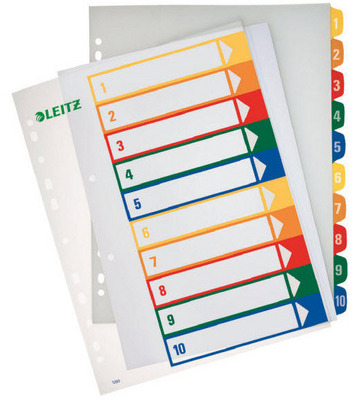 LEITZ® Register Vollformat überbreit farbig aus PP, transparent, Universallochung, für Zeigebuchtaschen, eine kostenlose Wordformatvorlage steht unter www.leitz.com/projectsystem zum Downloaden zur Verfügung, Format A4. A4 1-10 10teilig