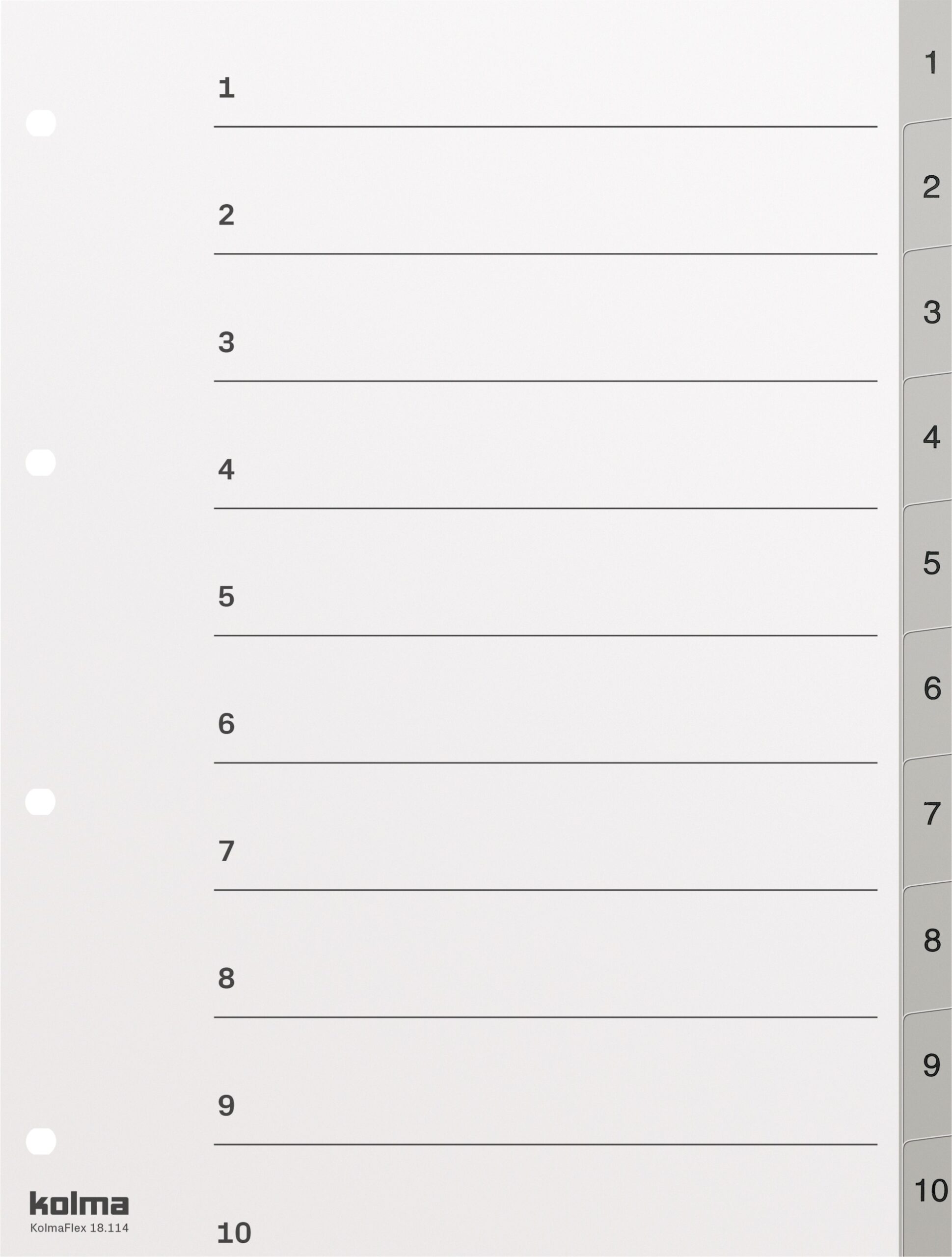 KOLMA Register KolmaFlex Vollformat grau, mit Indexblatt aus PP, sehr widerstandsfähig und reissfest, die ovale Lochung garantiert ein müheloses Umblättern. Nachhaltigkeit eco:plus: recyclingfähig, Recycelgehalt Abfall nach Gebrauch max. 100%. A4 1-10 10teilig 4 Loch