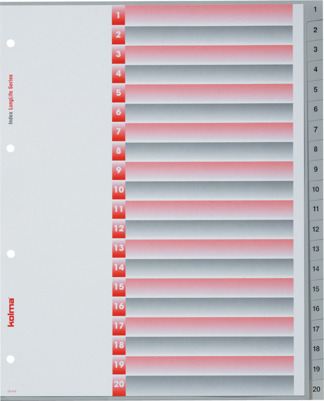 KOLMA Register LongLife XL Vollformat überbreit grau, mit Indexblatt aus extrem langlebigem Material (PVC), für Zeigebuchtaschen, sehr widerstandsfähig und reissfest, die ovale Lochung garantiert ein müheloses Umblättern. Nachhaltigkeit eco:plus: verlängertes Produktleben, recyclingfähig, Recycelgehalt Abfall nach Gebrauch max. 100%. A4 1-20 20teilig 4 Loch
