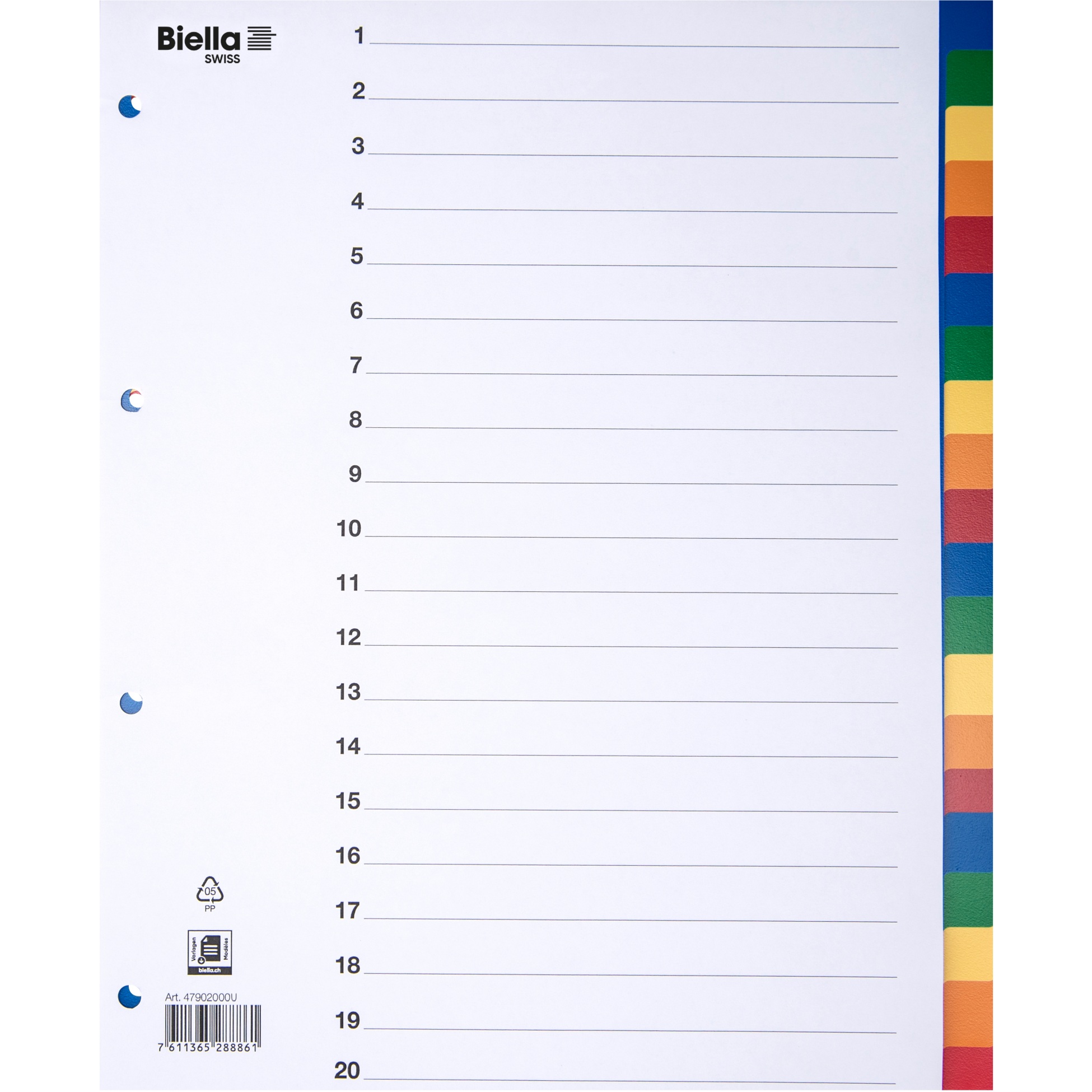BIELLA Register Vollformat überbreit aus PP farbig, für Zeigebuchtaschen, mit Indexblatt. A4 blanko 20teilig 4 Loch