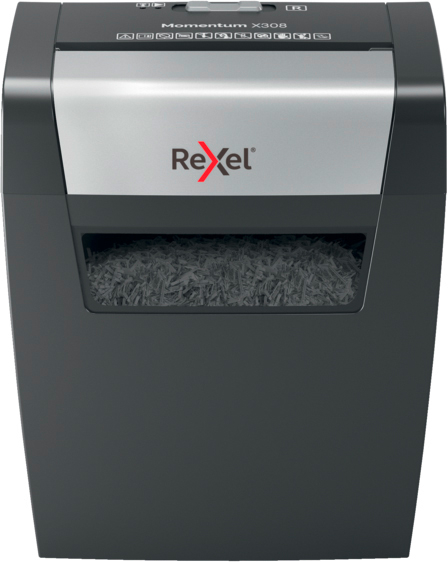 REXEL® Aktenvernichter Momentum X308 15 l Auffangbehälter mit Sichtfenster, volle DIN A4-Arbeitsbreite von 220 mm, Sicherheitsstufe P-3, schneidet bis zu 8 Blatt pro Vorgang, 3 Min. pausenloses Schreddern, vernichtet Heft- und Büroklammern, Motorleistung: 160 W, einfache, intuitive Bedienung durch Touch-Control-Tasten, automatische An- und Abschaltung, Leuchtanzeige für vollen Abfallbehälter und Abkühlphase. Masse: B 325 x H 343 x T 229 mm. Gewicht: 3,5 kg. Preis inkl. VRG. Zertifikat: CE, TÜV/GS. Partikelschnitt 5 x 42 mm