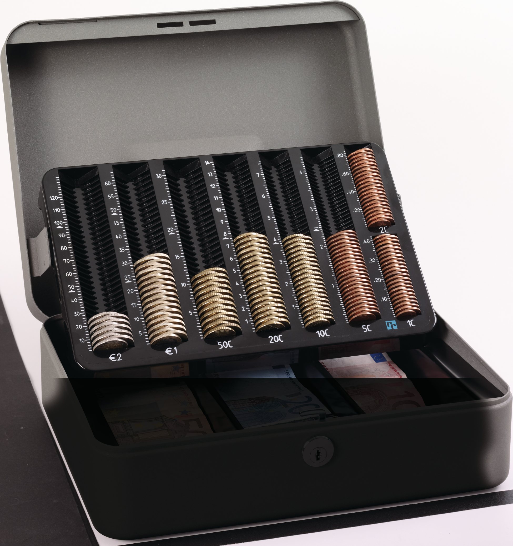 Diese Geldkassette beeindruckt mit ihrem äußerst robusten Gehäuse aus 1,2 mm Stahl, das für maximale Sicherheit und Langlebigkeit sorgt. Der ergonomische Tragegriff ermöglicht einfachen Transport, während der herausnehmbare Münz-Zähleinsatz mit präzisen M