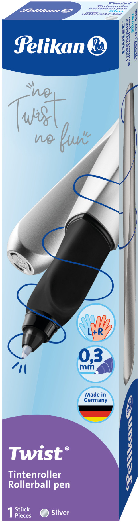 PELIKAN Tintenroller Twist ergonomische Griffzone, für Rechts- und Linkshänder, in gedrehtem Look, blaue Tinte löschbar, nachfüllbar. Nachhaltigkeit eco:plus: zerlegbar konstruiert, verlängertes Produktleben, recyclingfähig, Abfallminderung. silber glanz